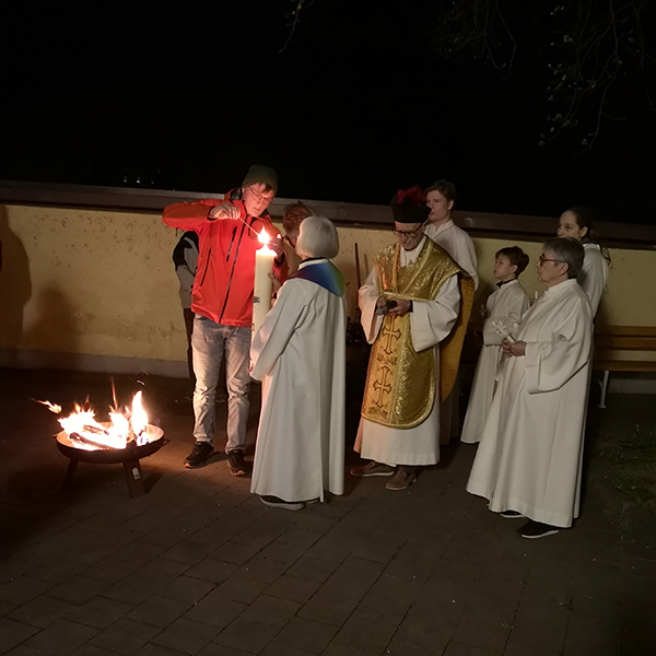 Wie schon seit vielen Jahren wurde auch heuer das Osterfeuer für die Feuerweihe wieder von den Pfadfindern vorbereitet. In der Pfarrkirche wurden das Weihwasser und die Osterkerze geweiht. Auch die Speisenweihe erfolgte. Musikalisch wurde der Gottesdienst vom RhythmusChor unter der Leitung von Manuela Hamberger gestaltet. Im Anschluss an den Gottesdienstes wurde von Vielen das Angebot zum gemeinsamen „Ostermahl“ in den Pfarrsaal angenommen.